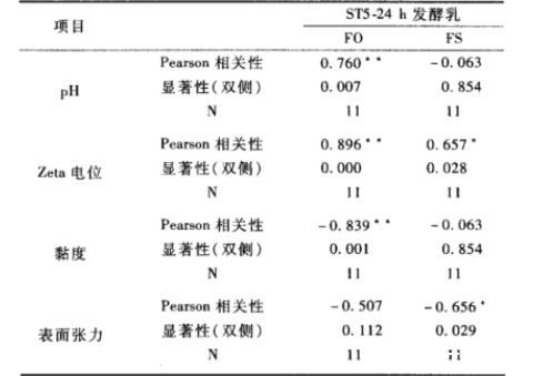 用SPSS軟件對混合液的pH值、Zeta電位、黏度、表面張力與起泡性質之間的簡單相關性分析如表1所示。從各指標與FO的相關性來看,其Pearson相關性分別為0.769、0.896、-0.839、-0.507,0.5<|r|<0.9。pH的改變不僅可以影響蛋白質的溶解度,尤其在等電點附近時容易聚集,同時還可以改變溶液中的電荷使蛋白質分子因分子間力而展開,從而影響蛋液的起泡能力。Zeta電位作為反映膠體溶液穩定性的重要指標,也表明了相鄰粒子間的相互作用力關系。所以pH值、Zeta電位與FO呈現正相關性。而溶液的黏度可以減緩蛋白質分子在界面上的吸附,從而降低起泡性,并且低表面張力可以在生成相同總面積的泡沫過程中少做功,所以黏度和表面張力與FO呈負相關。從與FS的相關性來看,其Pearson相關性分別為0.063、0.657、-0.063、-0.656,即Zeta電位和表面張力與FS呈現弱相關性,而pH和黏度可認為基本不相關。一般來說,溶液的表面黏度可以增加表面膜的強度,減緩泡沫滲流,從而增加泡沫穩定性。但混合物黏度的增加也并不意味著表面黏度的增加,并且決定泡沫穩定性的關鍵是液膜的強度,只有當表面膜具有一定的強度,低表面張力和高黏度值才可以減慢排液和液膜變薄速度,使泡沫的穩定性增加。由以上分析可知,溶液黏度是影響泡沫穩定性的重要因素,但不是唯一因素,是各種因素相互作用的結果。