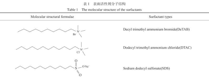 高純CO2:99.95%(φ),法國液化空氣集團;十二烷基三甲基氯化銨(DTAC)、十烷基三甲基溴化銨(DeTAB)、十二烷基磺酸鈉(SDS):含水1%(w),阿達瑪斯試劑有限公司。表面活性劑分子結構見表1。實驗用表面活性劑水溶液均為1.0%(w),實驗用水為去離子水。