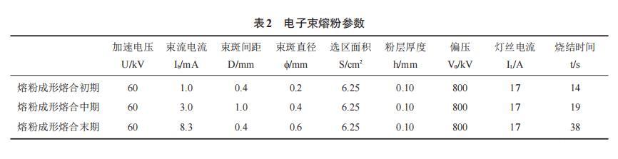 (1)試驗結(jié)果吻合熔粉理論模型,在熔合初期電子束預(yù)熱工藝下,離散的粉末微小粒徑的顆粒幾乎完全熔入大顆粒當(dāng)中,且顆粒與顆粒之間呈凝聚態(tài)結(jié)構(gòu)。