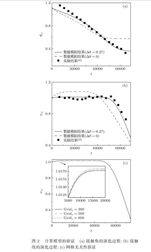 圖2計算模型的驗證(a)接觸角的演化過程;(b)接觸線的演化過程;(c)網格無關性驗證