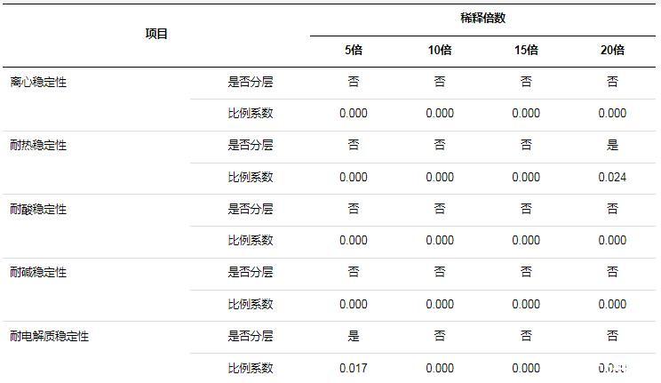 1)經(jīng)過(guò)稀釋后,耐熱穩(wěn)定性、耐電解質(zhì)穩(wěn)定性兩個(gè)測(cè)試項(xiàng)目雖然出現(xiàn)分層情況,但是比例系數(shù)均在0.1以下,氨基改性硅油柔軟劑保持較好的穩(wěn)定性;