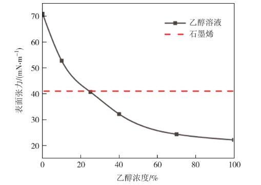 但是NMP存在價格昂貴、環境污染大的缺點,因此尋求一種環境友好、成本低的球磨溶劑對微晶石墨細化產業化具有重要的意義。水和乙醇的表面張力分別為70.95 mN·m-1和22.17 mN·m-1,我們采用一定體積比的乙醇和水調配出與微晶石墨表面能接近的乙醇水溶液,并以此為溶劑球磨微晶石墨,研究溶劑的表面張力對球磨后微晶石墨粒徑的影響。從圖1可知,25%乙醇溶液的表面能為40.69 mN·m-1,與石墨烯的表面能(40.80 mN·m-1)相近,從圖2可知,其對應的微晶石墨中位粒徑最小。當溶劑的表面能與微晶石墨表面能相近時,微晶石墨能更好地分散在溶劑中,從而提高球磨效率。所以在本工作中,選擇25%的乙醇水溶液作為球磨溶劑。