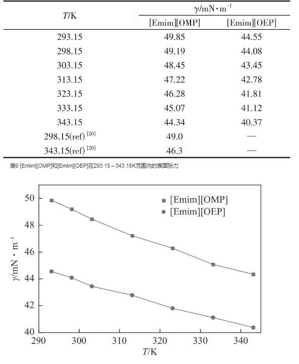 表面張力是一個對自由表面的物理和化學研究非常重要的性質,大部分離子液體的表面張力在30~60mN/m之間。[Emim][OMP]和[Emim][OEP]的表面張力實驗值如表9和圖5所示。對于亞磷酸酯離子液體,[Emim][OMP]在某論文中報道的其表面張力數據與本文最大偏差值達到了1.96mN/m。分析原因在于不同的課題組使用不同的測量方法測量表面張力,從而使測量實驗值產生較大的偏差。因此,對于表面張力的測定,要達到準確可靠且具有復現性存在一定難度。