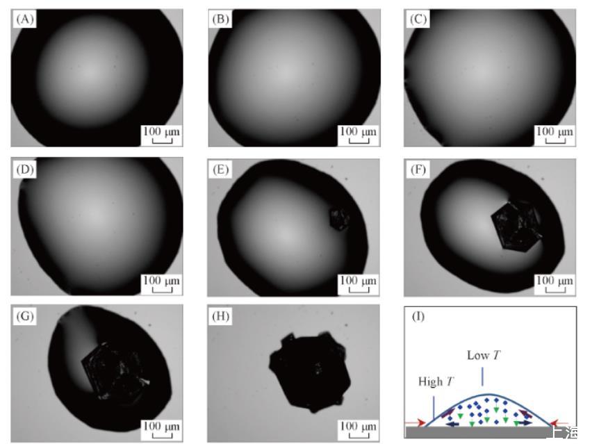 實(shí)驗(yàn)發(fā)現(xiàn),純水液滴和NaCl水溶液液滴在玻璃基底上蒸發(fā)時(shí)其三相接觸線均發(fā)生不同程度的收縮。圖1所示為NaCl溶液液滴的蒸發(fā)過(guò)程。可以看出,接觸線的收縮并非連續(xù)不斷,而是在一定時(shí)間內(nèi)先保持“釘扎”[圖1(A),(B)].在此過(guò)程中,接觸角不斷減小,從而使得表面張力的水平分力增大,當(dāng)其超越基底對(duì)接觸線產(chǎn)生釘扎作用時(shí),就會(huì)引起接觸線的收縮。由于基底結(jié)構(gòu)的不均勻性,液滴各方向的收縮也可能是不均勻的,如圖1(C)——(H)所示。由于蒸發(fā)過(guò)程中接觸線不能釘扎,蒸發(fā)造成的Marangoni對(duì)流以及重力沉降作用使得NaCl在液滴中心區(qū)域富集,如圖1(I)所示。因而NaCl晶體首先在液滴中心區(qū)域析出。