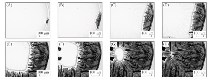 當(dāng)液滴中NaCl含量較高時(shí),鹽并不是在液滴的邊緣析出,而是在靠近邊緣的位置析出。這可能是液滴蒸發(fā)初期毛細(xì)補(bǔ)償流與Marangoni對(duì)流的競(jìng)爭(zhēng)使得溶質(zhì)在近邊緣位置富集所致。此時(shí),液滴邊緣已成為凝膠區(qū)(表面張力小),而內(nèi)部仍為液態(tài)區(qū),因而析出的NaCl晶體將在內(nèi)部液相表面張力的牽引下向內(nèi)部運(yùn)動(dòng),并逐漸形成更大尺寸的塊狀鹽晶體。說(shuō)明當(dāng)NaCl濃度較高時(shí),即使存在PTFE顆粒,仍有部分NaCl會(huì)按其自身生長(zhǎng)特性形成多面體結(jié)構(gòu)。而液滴邊緣凝膠區(qū)枝晶的生長(zhǎng)則與圖2相類似,呈現(xiàn)出NaCl與膠體顆粒之間復(fù)雜耦合的特點(diǎn)。