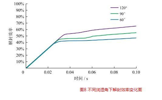 孔隙表面潤濕性對注氣解封過程及流體微觀分布具有較大影響。建立120°、90°和60°等3種不同潤濕角的模型分別代表潤濕反轉(zhuǎn)劑作用后疏水、中性潤濕和親水的情形,研究不同潤濕性條件下流體微觀分布演化特征和解封效率差異性(圖8)。從圖中可以看出,孔隙壁面親水條件下,注入氣體沿著阻力小的大孔喉快速竄流,出口端見氣較早,說明孔隙壁面親水有助于水封氣藏的快速解封;但解封過程中氣體很難進(jìn)入小孔喉區(qū)域內(nèi),這是由于親水孔隙中的毛細(xì)管力對氣驅(qū)流動產(chǎn)生較強(qiáng)的抑制作用,且微觀竄流通道內(nèi)孔隙表面形成水膜,導(dǎo)致氣體微觀波及效率降低,局部區(qū)域仍具有較高的含水飽和度,解封效率較低。孔隙壁面疏水條件下,毛細(xì)管力是氣驅(qū)水的動力,緩解了毛細(xì)管指進(jìn)引起的水相快速突破,一定程度地促進(jìn)了注氣解封驅(qū)替前緣的均勻發(fā)展,導(dǎo)致氣體微觀波及效率升高,因此,疏水孔隙的解封過程氣體突破較慢,但解封效率較高。而孔隙壁面中性潤濕條件下,解封過程的突破時(shí)間和解封效率介于前兩者之間。因此,隨著潤濕反轉(zhuǎn)劑濃度的增加,潤濕反轉(zhuǎn)劑能夠?qū)⒖紫侗砻鏉櫇裥杂捎H水轉(zhuǎn)化為疏水,對解封過程產(chǎn)生一定的抑制作用,但能夠大幅提高解封效率。