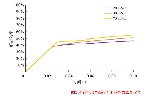 氣水界面張力對注氣解封過程及流體微觀分布具有較大影響。建立70 mN/m、40 mN/m和20 mN/m等3種不同的氣水界面張力的模型,分別代表潤濕反轉(zhuǎn)劑作用后的氣水界面張力變化情況,研究不同氣水界面張力條件下流體微觀分布演化特征和解封效率差異性(圖9)。從圖中可以看出,隨著氣水界面張力的降低,毛細(xì)管力減小,大幅降低注氣解封過程流體流動阻力,促進(jìn)了氣相優(yōu)勢通道的快速形成,說明氣水界面張力的降低有助于減小解封壓力,實(shí)現(xiàn)水封氣藏的快速解封;但同時(shí)氣水界面張力的降低,會導(dǎo)致氣體微觀波及效率降低,部分區(qū)域仍具有較高的含水飽和度,解封效率略微降低。因此,隨著潤濕反轉(zhuǎn)劑濃度的增加,潤濕反轉(zhuǎn)劑能夠降低氣水界面張力,對解封過程產(chǎn)生明顯的促進(jìn)作用,但解封效率會略微降低。