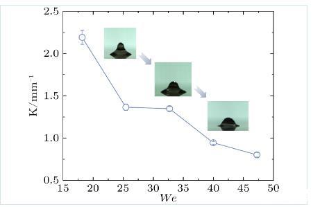為了更加清晰地表明液滴撞擊的We對(duì)三種模態(tài)的影響,根據(jù)實(shí)驗(yàn)結(jié)果總結(jié)了撞擊We與電毛細(xì)力Cae的關(guān)系,如圖7所示。函數(shù)結(jié)果表明,第一模態(tài)可以發(fā)生在所有韋伯?dāng)?shù)內(nèi),并且隨著韋伯?dāng)?shù)的增加,第一模態(tài)的閾值電場(chǎng)也在不斷增加。第二模態(tài)的閾值電場(chǎng)范圍是三種模態(tài)中最小的,韋伯?dāng)?shù)越大時(shí)需要更強(qiáng)的電場(chǎng)才能產(chǎn)生第二模態(tài)。第三模態(tài)的閾值電場(chǎng)隨著韋伯?dāng)?shù)的增加也在不斷增大,只是液滴出現(xiàn)第三模態(tài)的電場(chǎng)范圍在減小。這可能是由于韋伯?dāng)?shù)的變化導(dǎo)致拉伸液滴形態(tài)的變化,從而影響了靜電力的強(qiáng)度。基于上述考慮,為了深入剖析三種模態(tài)閾值電場(chǎng)變化的原因,根據(jù)實(shí)驗(yàn)結(jié)果對(duì)無(wú)外加電場(chǎng)條件下液滴拉伸過程中韋伯?dāng)?shù)We與平均頂點(diǎn)曲率K(如式7所示)的關(guān)系進(jìn)行了討論,如圖8所示。從關(guān)系圖中可以看出,當(dāng)液滴處于回縮階段并達(dá)到最大拉伸高度時(shí),韋伯?dāng)?shù)的增加會(huì)伴隨著液滴頂部曲率半徑的增大,而曲率半徑的增大將會(huì)導(dǎo)致靜電力的相對(duì)減弱。