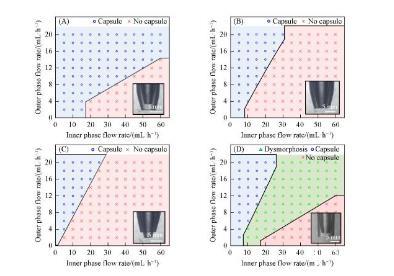 為了深入研究微流控器件結構對水/水微囊成型過程的影響規(guī)律,分別制備了內(nèi)管管口內(nèi)縮、內(nèi)外管管口平齊、內(nèi)管管口伸出、內(nèi)管管口內(nèi)縮外管管口不拉伸等4種同軸微流控器件,并通過系統(tǒng)改變內(nèi)相和外相流速,判斷水/水微囊的成型情況,最終確定水/水微囊的制備相圖,分別如圖2(A)——(D)所示。水/水微囊形成的關鍵是內(nèi)相在外相的剪切下形成液滴,同時外相在重力作用下脫離管口生成水/水微囊。由于內(nèi)外相均是水溶液,內(nèi)相/外相界面張力較小,并且流體黏度較大,內(nèi)相不容易在外相的剪切下形成液滴,進而被外相包裹形成水/水微囊,因此外相流速增大,對內(nèi)相剪切加強,更易形成水/水微囊。