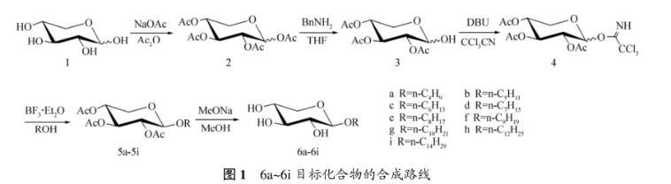 采用全乙酰化的木糖(2)在四氯化錫催化下與一系列脂肪醇發生偶聯反應,對時間要嚴格控制,否則有部分轉化成α-異構體,當時間過長時,還會形成以α-糖苷為主的產物和少量2-位脫保護的糖苷副產物。參考烷基-β-D-葡萄糖苷等合成與性能研究成果,按照Scheme1所示的路線,以D-木糖(1)為原料通過乙酰化、脫1-位乙?;?、與三氯乙腈反應,得到相應的三氯乙酰亞胺酯(4)。采用易于構筑1,2-反式糖苷鍵的三氯乙酰亞胺酯法,以三氟化硼乙醚作糖苷化偶聯反應的催化劑,使得具有鄰基參與效應的三氯乙酰亞胺酯(4)與相應的脂肪醇反應及相應的脫乙酰基保護,合成一系列烷基-β-D-吡喃木糖苷,如圖1所示。本文作者對其溶解性、表面張力、乳化性能、液晶性能、熱穩定性等理化性質進行研究。
