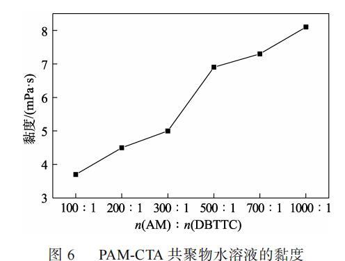 由圖6可知,隨著DBTTC用量的減少,共聚物水溶液黏度緩慢提升,由3.7 mPa·s逐漸升高到8.1 mPa·s,這是因為,隨著RAFT試劑用量的減少,共聚物相對分子質量增加,共聚物鏈段增長,共聚物鏈段之間的纏繞作用增強,共聚物水溶液黏度升高。適當地調節RAFT試劑的用量可以達到控制共聚物水溶液黏度的目的。