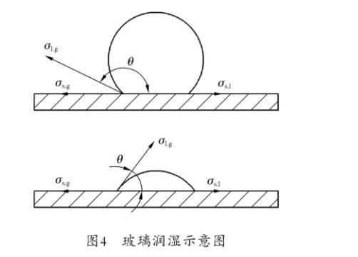 圖4為玻璃潤濕示意圖。如果液體(熔體)和固體間的表面張力很大時,趨向于收縮成球狀以減少兩相界面,潤濕角q也較大,q>90°,稱為液相不潤濕固相;q<90°,稱為液相潤濕固相。