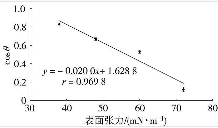 葉片臨界表面張力直接影響藥液在葉片表面的沉積特性,臨界表面張力越小越不利于藥液霧滴的沉積、潤濕和展布。測試液的表面張力與cosθ間呈顯著負相關關系(圖3),其擬合方程為y=0.020 0x+1.628 8(r=0.969 8),其中x為表面張力,y為cosθ。根據擬合方程計算得到煙草葉片的臨界表面張力為31.44 mN/m。與王亞虹等和陳海濤等測定的K326和云87兩個煙草品種相近,表明不同煙草品種葉片臨界表面張力值差異不大,且明顯低于小麥、棉花和茄子等,說明普通農藥霧滴不容易在煙草葉片表面潤濕和展布,因此需要合理使用助劑降低農藥藥液的表面張力至低于煙草葉片臨界表面張力。