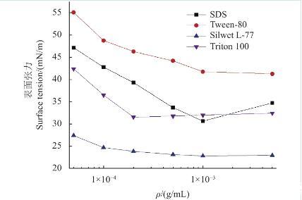 圖2 4種供試表面活性劑表面張力隨其質(zhì)量濃度變化的趨勢(shì)