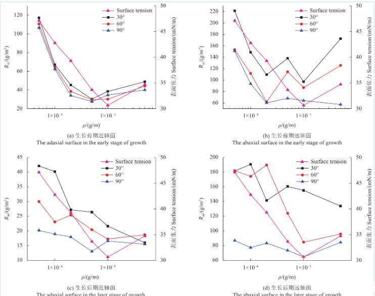 圖6為不同濃度SilwetL-77溶液在蘋果葉片近、遠(yuǎn)軸面的Rm變化規(guī)律。由圖可知,當(dāng)溶液質(zhì)量濃度低于cmc時(shí),蘋果葉片生長(zhǎng)前、后期遠(yuǎn)軸面的Rm值和表面張力均隨溶液質(zhì)量濃度的降低而減小。此外,蘋果葉片生長(zhǎng)后期近軸面只有在30°傾角時(shí)的Rm值與表面張力隨溶液質(zhì)量濃度的提高而減小,60°傾角和90°傾角時(shí)Rm值隨溶液濃度變化不大。蘋果葉片生長(zhǎng)后期遠(yuǎn)軸面Rm值和表面張力隨溶液濃度的變化與生長(zhǎng)前期基本一致。