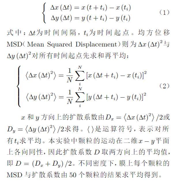 實驗采用Olympus顯微鏡(配備60倍物鏡)觀察顆粒在膜上的布朗運動,同時利用電子增益高速攝像機(Andor 897 EMCCD)進(jìn)行拍攝。每個視頻拍攝時間為200 s,幀頻為0.05 s,曝光時間5 ms,圖像尺寸為300像素×300像素,分辨率為0.26μm/m。采集原始圖像中的顆粒灰度值不符合標(biāo)準(zhǔn)高斯分布,因此使用圖像處理軟件ImageJ對圖像進(jìn)行背景去噪聲(Background Subtraction)和高斯模糊(Gauss-ian Blur)處理(圖3(a)),使顆粒灰度值達(dá)到標(biāo)準(zhǔn)高斯分布(圖3(b))。之后用Video Spot Tracker軟件定位每個顆粒的灰度峰值(圖3(c)),即顆粒質(zhì)心,定位誤差僅為0.5像素,進(jìn)而對顆粒二維運動軌跡(平面)進(jìn)行實時跟蹤。軟件自動將顆粒在每一時刻的像素位置坐標(biāo)存入計算機中,使用MATLAB計算顆粒在不同時間間隔Δt內(nèi)沿和方向的位移,計算公式如下: