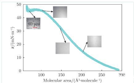 圖2為膜表面壓強隨膜密度的變化曲線,(以DPPC磷脂分子所占平均面積作為衡量膜密度的物理量)。在顯微鏡下觀察了膜在不同密度下的形貌(圖2中4張照片)。膜被壓縮到100?2/molecule之前,處于液態(tài)擴張(Liquid Expanded,LE)相,磷脂分子排列較松散,膜表面結(jié)構(gòu)均勻。當(dāng)膜被壓縮到60~100?2/molecule時,膜上開始出現(xiàn)直徑為幾微米的磷脂凝聚(Tilted Condensed,TC)相(照片中斑點),TC區(qū)域內(nèi)磷脂分子的排列比LE區(qū)域更緊密。熒光劑Texas red DHPE傾向于分布在LE區(qū)域,因此LE區(qū)域顯示為淺色,TC區(qū)域顯示為深色。膜繼續(xù)被壓縮,在LE?TC共存相階段,膜表面壓強恒定在45 mM/m左右,TC區(qū)域數(shù)量和面積占比增大。當(dāng)膜被進(jìn)一步壓縮(<60?2/molecule),此時膜表面幾乎被TC區(qū)域占據(jù),TC區(qū)域相互擠壓,導(dǎo)致膜表面壓強直線上升,LE區(qū)域僅存在于TC區(qū)域之間的空隙。