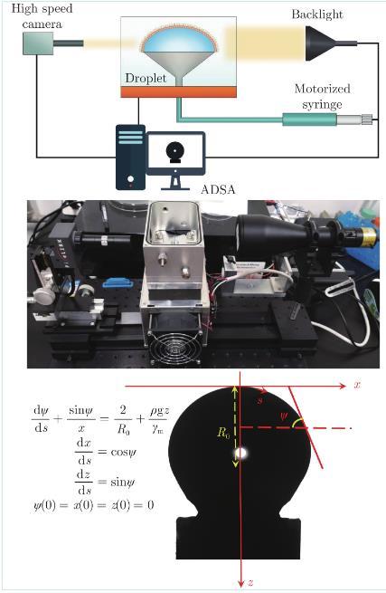 采用課題組自主研發(fā)的約束液滴表面測量儀(Constrained Drop Surfactometry,CDS)測量膜在不同密度下的表面張力,如圖1所示,圖中x與z分別代表水平與豎直方向,s代表液滴表面切向方向,ψ為液滴表面與水平方向內(nèi)夾角,R0為液滴半徑,ρ為液滴密度,g為重力加速度。CDS上的圓形基座用于盛放純水液滴(約10μL),以微量進(jìn)樣針將稀釋的固爾蘇–氯仿溶液滴定到液滴表面,形成形狀類似于肺泡的水?氣界面固爾蘇肺表面活性劑膜?;醒氲男】淄ㄟ^導(dǎo)管與注射器相連,注/抽水速度由Labview編程的推進(jìn)器控制,以此調(diào)節(jié)液滴表面積的變化速率。實驗測量的是膜在壓縮過程中表面張力與膜密度變化的關(guān)系,液滴表面積以0.05的準(zhǔn)靜態(tài)速率縮小。液滴的輪廓由照相機拍攝。膜表面張力和表面積以ADSA(Axisymmetric Drop Shape Analysis)方法分析得出。膜表面壓強,其中,純水表面張力。
