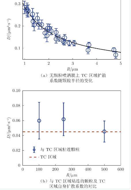均為常數,取自文獻。肺表面活性劑單層膜厚度為1 nm,由此可得膜的體黏度為0.77 Pa·s,是純水黏度的770倍。圖9(b)將與TC區域粘連的顆粒的擴散系數(以圓形表示)與單獨TC區域的擴散系數(以虛線表示)進行了對比,后者選取3.5μm為平均TC區域直徑(參照圖2照片),由HPW模型代入計算得出??梢钥闯?,在實驗統計誤差范圍內,二者近似相等,表明顆粒與TC區域形成的整體受力主要來自于TC區域。TC區域直徑遠大于顆粒直徑,膜內黏滯阻力更大;此外,膜的體黏度遠大于水相,因此水相對顆粒浸沒部分施加的黏滯阻力可忽略不計。