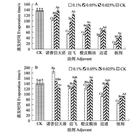 葉片背面,助劑質(zhì)量分?jǐn)?shù)為0.025%時,與CK相比,極潤助劑能使藥液蒸發(fā)時間縮短34.84%,其次是諾普信天盾縮短12.56%,而邁道和邁飛與CK間無顯著差異,而橙皮精油的蒸發(fā)時間增加9.24%;助劑質(zhì)量分?jǐn)?shù)為0.05%時,極潤助劑使藥液蒸發(fā)時間縮短41.00%,其次是邁道和邁飛均縮短9.72%,而橙皮精油和諾普信天盾與CK無顯著差異;助劑質(zhì)量分?jǐn)?shù)為0.1%時,極潤助劑使藥液蒸發(fā)時間縮短53.79%,其次是邁道縮短34.36%,橙皮精油和邁飛則分別縮短13.27%和13.04%,而諾普信天盾的蒸發(fā)時間增加31.28%(圖5B)。