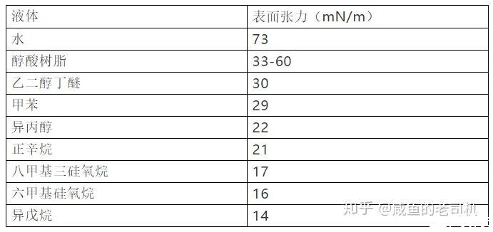 常見液體物質的表面張力