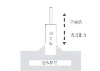 本試驗表面張力值采用吊板法測量,如圖1所示:白金板因被測溶液的表面張力而將其向下拉,當(dāng)總表面張力與液體的重量平衡時,通過測量白金板浸入待測溶液的深度,便可知溶液的表面張力值,其原理見式(1)。