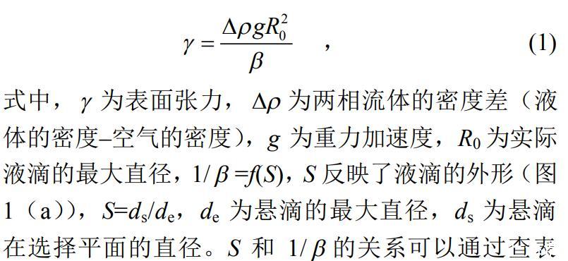 試驗(yàn)為比較3種液體表面張力的大小,采用懸滴法對(duì)液體的表面張力進(jìn)行測(cè)量,懸滴法的基本原理是:處于毛細(xì)管端液體懸滴的形狀與液體的表面張力有關(guān),在重力作用下,毛細(xì)管端形成的球形液滴的形變,隨著液滴有效密度的增加而增加并隨著液滴界面張力的增加而減小。通過(guò)Young–Laplace方程可以推導(dǎo)得到懸滴法計(jì)算表面張力的基本方程: