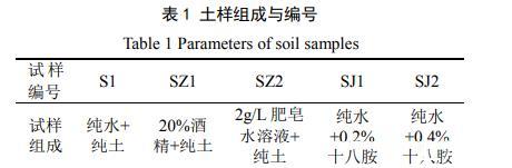 試驗(yàn)用土取自云南省境內(nèi)昆曲高速公路嚴(yán)家山段,為淺灰色弱膨脹土,其自由膨脹率為55.7%,液限為41%,塑限為20.3%。取回的土樣經(jīng)過(guò)風(fēng)干、碾碎后過(guò)2 mm的篩備用。為研究氣–液界面張力對(duì)膨脹土干縮開裂的影響,采用3種不同表面張力的液體作為土中的液相,分別為:純水、體積百分?jǐn)?shù)為20%的酒精溶液和含量為2 g/L的肥皂水;通過(guò)在土體中混合斥水劑的方法配制不同接觸角的土樣,斥水劑十八烷基伯胺(C18H39N),簡(jiǎn)稱:十八胺,為堿性白色蠟狀粉末,純度為99%,配制兩種斥水土樣,十八胺含量分別為:0.2%和0.4%。各土樣的成分和編號(hào)如表1所示。