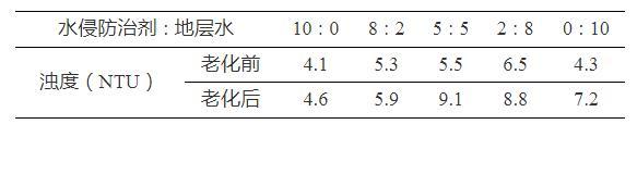 將水侵防治劑與地層水按不同比例(體積比)混合,測(cè)定其濁度值,并將其在80℃下放置4 h后,繼續(xù)測(cè)定其濁度值變化情況,以此考察水侵防治劑與地層水的配伍性,結(jié)果見(jiàn)表2。可以看出,水侵防治劑的自身濁度較低(僅為4.1NTU),并且其與地層水按不同比例混合后的濁度值均未明顯增大,在80℃下老化4 h后濁度值也仍小于10NTU,說(shuō)明水侵防治劑與地層水具有良好的配伍性。