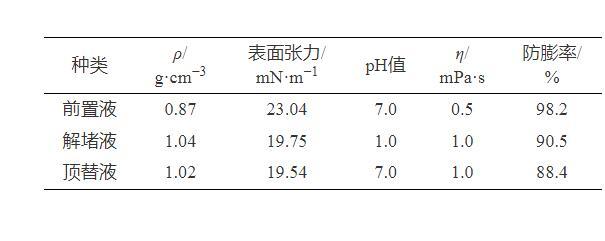 表3為解堵液體系的基本性能評(píng)價(jià)結(jié)果,可以看出,解堵液體系的黏度值和pH值較低,并且具有較低的表面張力,有利于注入和返排。另外,體系具有良好的防膨效果,能夠防止黏土礦物的水化膨脹。