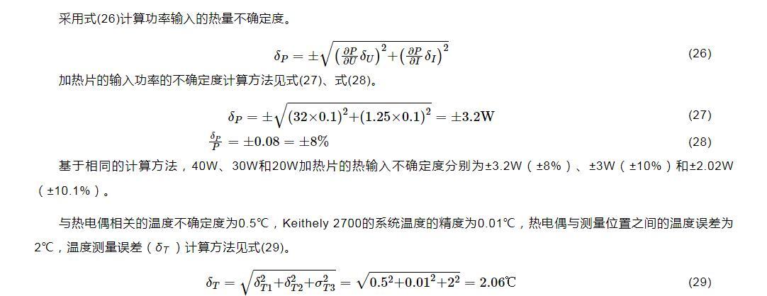 加熱片的輸入功率的不確定度計算方法見式(27)、式(28)。