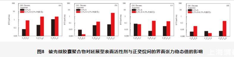 圖8破殼微膠囊聚合物對延展型表面活性劑與正癸烷間的界面張力穩態值的影響
