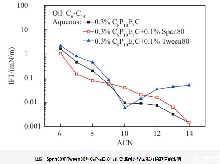 水溶性非離子表面活性劑Tween80與C8P10E5C復配時,一方面,混合溶液的水溶性增強,體系的nmin值從≥14降低至10;另一方面,Tween80從水相一側向界面的競爭吸附,也會破壞C8P10E5C原來緊密排列的界面膜,造成高烷烴碳數油相的界面張力明顯升高。