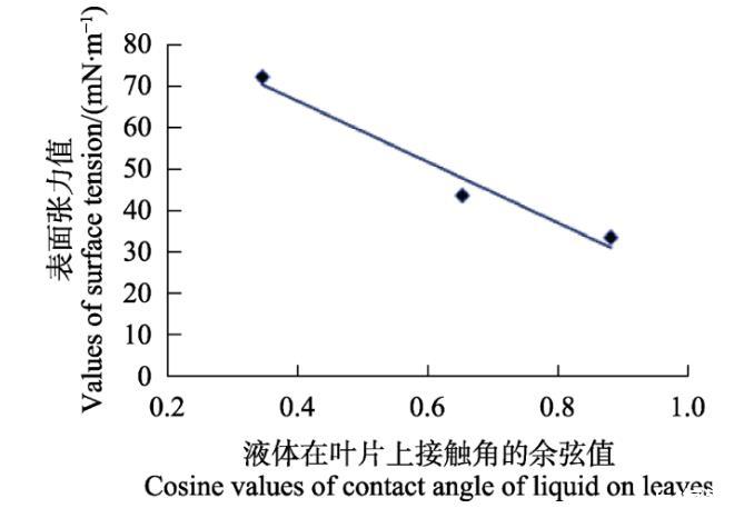 采集新鮮的芒果葉片,新老葉比例1∶1,取其平整部分且不破壞其葉面結(jié)構(gòu),用雙面膠將其固定在載玻片上構(gòu)成平面,使葉面保持自然狀態(tài)。分別將水、二甲基甲酰胺(DMF)、二甲基亞砜(DMSO)3種液體通過微量注射器滴加到葉面上,當液體在葉面形成液滴后,通過接觸角測定儀拍照后測量其接觸角。從滴加樣品到測得接觸角在5 s內(nèi)完成,每個處理重復10次,取平均值。液體的表面張力值通過表面張力儀測定,每個處理重復5次,取平均值。將測得的水、DMF、DMSO液體表面張力值和接觸角的cosθ值分別為橫縱坐標作圖,獲取回歸方程,當接觸角為零時求得芒果葉的臨界表面張力值。為確保液滴的完整性和穩(wěn)定性,整個測定過程的溫度保持在25~28℃,相對濕度為80%左右的封閉環(huán)境下進行。