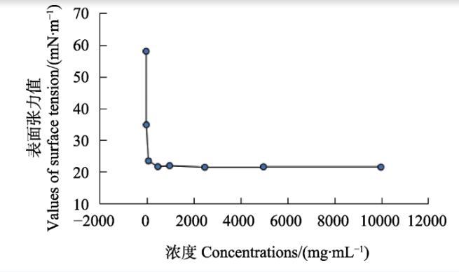 按國家標準GB 5549—2010的方法,將助劑380配置成1、10、100、1000、10 000、100 000 mg/mL系列濃度,用表面張力儀測定相應(yīng)濃度藥液的表面張力。以濃度和其對應(yīng)的表面張力值分別為橫縱坐標作圖,獲得一條曲線,曲線拐點對應(yīng)的濃度即為助劑380的臨界膠束濃度。