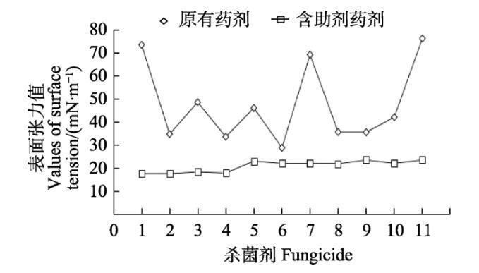 參照各供試殺菌劑田間推薦劑量,分別配置10 mL藥液2組,其中一組添加助劑,一組不含助劑。通過表面張力儀測試各藥液的表面張力值。每組設(shè)置3個重復,以水作為空白對照。