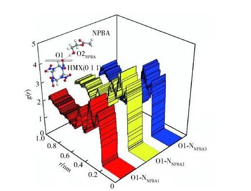 HMX(0 1 1)晶面上—NO2基團中氧原子O1與NPBA分子鏈上—COOCH2CH2OH和—COOCH3基團上羰基氧原子O1NPBA之間的徑向分布函數曲線見圖4.