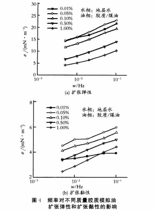 擴(kuò)張頻率對(duì)不同質(zhì)量分?jǐn)?shù)膠質(zhì)模擬油的界面擴(kuò)張彈性和黏性的影響見圖4。從圖4中可以看出,隨著頻率降低,總體上擴(kuò)張彈性和黏性均逐漸減小,說明膠質(zhì)在油水界面形成的是黏彈膜。當(dāng)界面變形速度較慢時(shí),各種弛豫過程有足夠的時(shí)間去修復(fù)由界面面積變化帶來的界面張力梯度,因而擴(kuò)張彈性和黏性均隨頻率的降低而減小。