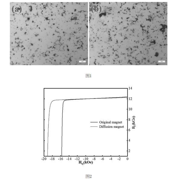 釹鐵硼磁體因具備高磁能積、高矯頑力等優異的磁學性能已被廣泛應用在電子信息、新能源汽車、風力發電等領域。隨著科技的進步,市場對釹鐵硼磁體的磁性能提出了更高的要求。傳統的高矯頑力磁體制備方法需要使用大量的重稀土元素(Dy/Tb),不但增加了成本,同時還造成剩磁和最大磁能積的下降。而晶界擴散工藝在實現大幅度提升矯頑力的同時可以保證剩磁幾乎沒有損失,是高矯頑力釹鐵硼磁體降低成本的重要制備方法。根據燒結釹鐵硼永磁體的矯頑力機制,反磁化疇首先在晶粒表面形成,晶粒表面是磁體內最薄弱的環節,提高晶粒表面的各向異性場可以推遲反磁化疇核的形成,從而提高整個磁體的矯頑力,晶界擴散就是基于這一原理提出的。