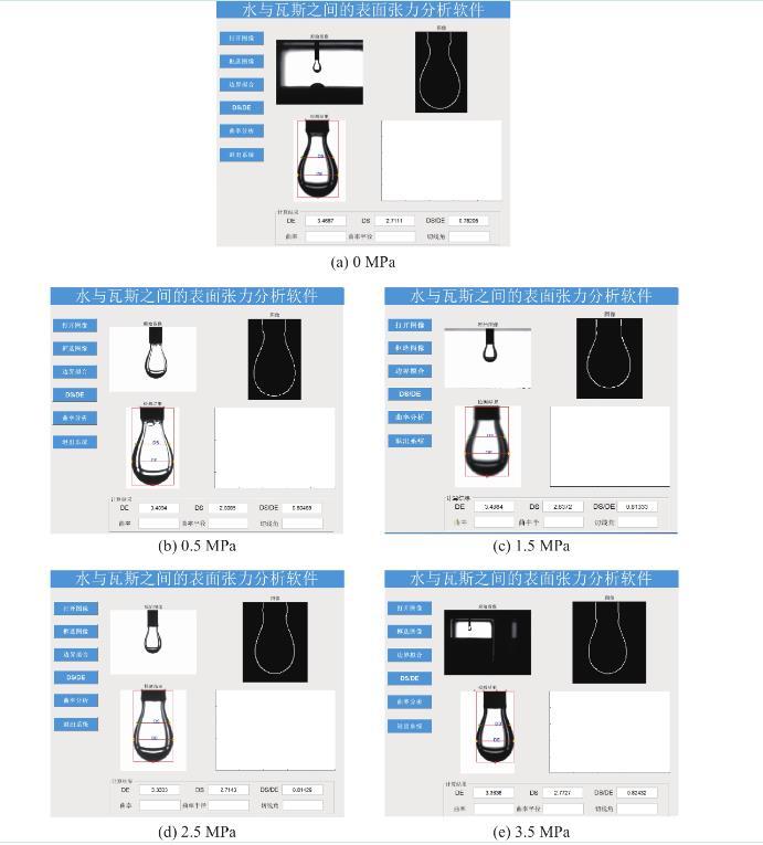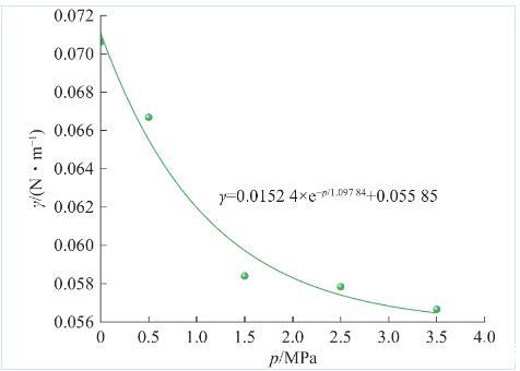 采用團隊自開發的水與瓦斯之間的表面張力分析軟件對不同瓦斯壓力條件下的水滴形貌(圖3)進行分析,即可獲得式(1)中的Ds及De。F為G修正后的形狀因子,F通過查表及插值法獲得,式(1)中的參數見表1,將表1中的參數帶入式(1)及式(2),即可獲得不同瓦斯壓力條件下水與瓦斯之間的表面張力(圖4)。