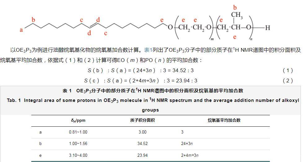 以O(shè)E3P3為例進行油醇烷氧基化物的烷氧基加合數(shù)計算。表1列出了OE3P3分子中的部分質(zhì)子在1H NMR譜圖中的積分面積及烷氧基平均加合數(shù),依據(jù)式(1)和(2)計算可得EO(m)和PO(n)的平均加合數(shù):