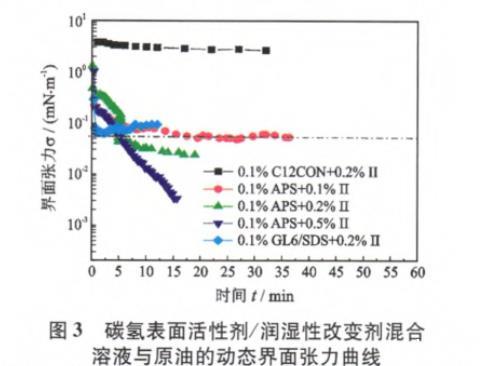 圖3為典型的碳氫表面活性劑/潤濕性改變劑混合溶液與原油的動態界面張力曲線。從圖3可以看出,0.1%C12CON+0.2%Ⅱ型潤濕性改變劑、0.1%GL6/SDS(混合質量比為4∶1)+0.2%Ⅱ型潤濕性改變劑混合溶液與原油的界面張力分別為2.573 2 mN/m和0.063 5 mN/m,但0.1%APS+0.2%Ⅱ型潤濕性改變劑混合溶液與原油的界面張力可以達到0.024 6 mN/m。而且,0.1%APS+0.1%Ⅱ混合溶液與原油的界面張力也低于0.05 mN/m,0.1%APS+0.5%Ⅱ型潤濕性改變劑混合溶液與原油的界面張力甚至可以達到小于0.003 5 mN/m的超低界面張力。