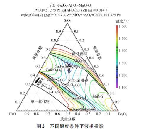 由圖1可知,液相生成量隨溫度升高而增大,當溫度高于1250℃時,液相形成加快。試驗中,堿度主要由改變CaO的含量來調節,其它各組分基本不變。圖2中,當燒結溫度從1100℃升高到1600℃時,液相區域迅速增大,向Fe?O?角移動,此時有更多的Fe?O?熔化在液相中,有利于高強度鐵酸鈣的生成。隨著堿度提高(如圖中箭頭所示),在1500℃左右時,硅酸二鈣(Ca?SiO?)發生由α-Ca?SiO?向α’-Ca?SiO?的晶型轉變,晶型轉變引起體積膨脹,會影響燒結礦的強度。