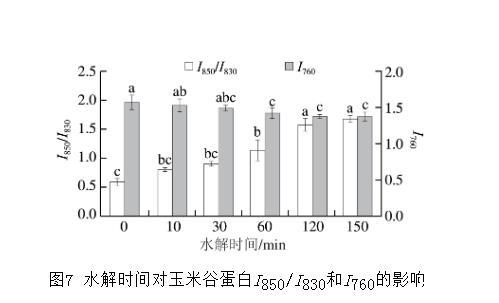 圖7水解時間對玉米谷蛋白I850/I830和I760的影響