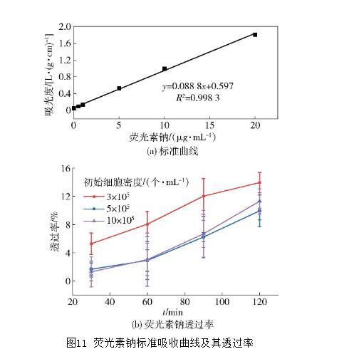 標(biāo)記物跨膜通量的測定也可以反映單層細(xì)胞膜的完整性,熒光素鈉標(biāo)準(zhǔn)吸收曲線及其在不同時(shí)間段的透過率見圖11。由圖11(a)的熒光素鈉的標(biāo)準(zhǔn)曲線方程中,代入BL側(cè)的吸光度,可計(jì)算出BL側(cè)的熒光素鈉質(zhì)量,根據(jù)式(4),即可得出不同時(shí)間段的熒光素鈉透過率[圖11(b)]。由圖11(b)可知,孵育2 h后,3個(gè)不同初始密度的細(xì)胞模型均對(duì)熒光素鈉具有一定的透過性。初始細(xì)胞密度為3×105個(gè)/mL的細(xì)胞模型對(duì)熒光素鈉的透過率相對(duì)較高,達(dá)到13.96%;初始AP側(cè)加入熒光素鈉的密度為20μg/mL,最終3種模型的熒光素鈉透過量均小于0.011 6μg/min,說明3種細(xì)胞模型單層膜的致密性能良好。