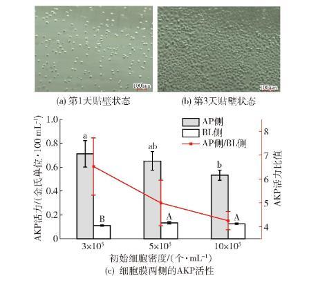 Caco-2細(xì)胞培養(yǎng)狀態(tài)及培養(yǎng)21 d后的堿性磷酸酶活性見圖10。由圖10(a)、(b)可以發(fā)現(xiàn),培養(yǎng)3 d過程中,單層Caco-2細(xì)胞生長穩(wěn)定并均勻分布在Transwell上,貼壁情況良好。堿性磷酸酶AKP是小腸刷狀緣細(xì)胞的標(biāo)志酶,其濃度代表了單層Caco-2細(xì)胞的極化和功能。觀察圖10(c)可知,培養(yǎng)21 d后,不同接種細(xì)胞密度在AP側(cè)的酶活性均高于BL側(cè)的酶活性,屬正常的細(xì)胞極化結(jié)果。初始密度為3×105個(gè)/mL的細(xì)胞AP側(cè)的AKP活性高于其他兩組,其BL側(cè)的AKP活性低于其他兩組,證明該組細(xì)胞分化情況較好。隨著細(xì)胞密度的增大,AP側(cè)與BP側(cè)活力的比值呈下降趨勢,說明初始細(xì)胞密度過大不利于細(xì)胞的分化。實(shí)驗(yàn)結(jié)果表明,3種模型細(xì)胞均生長良好。