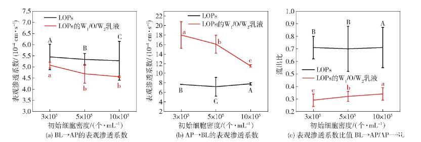 圖(a)和圖(b)中,不同大寫、小寫字母分別表示LOPs、LOPs雙重乳液的組間表觀滲透系數(shù)存在顯著差異(P<0.05),圖(c)中,不同大寫、小寫字母分別表示LOPs、LOPs雙重乳液的組間流出比存在顯著差異(P<0.05)。