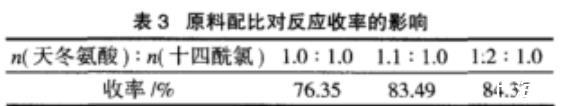 由以上研究得到合成N-十四酰基天冬氨酸的較佳工藝條件為:反應溫度5℃,pH為10~11,n(天冬氨酸)∶n(十四酰氯)=1.1∶1.0,反應時間3.5h,收率為83.49%。