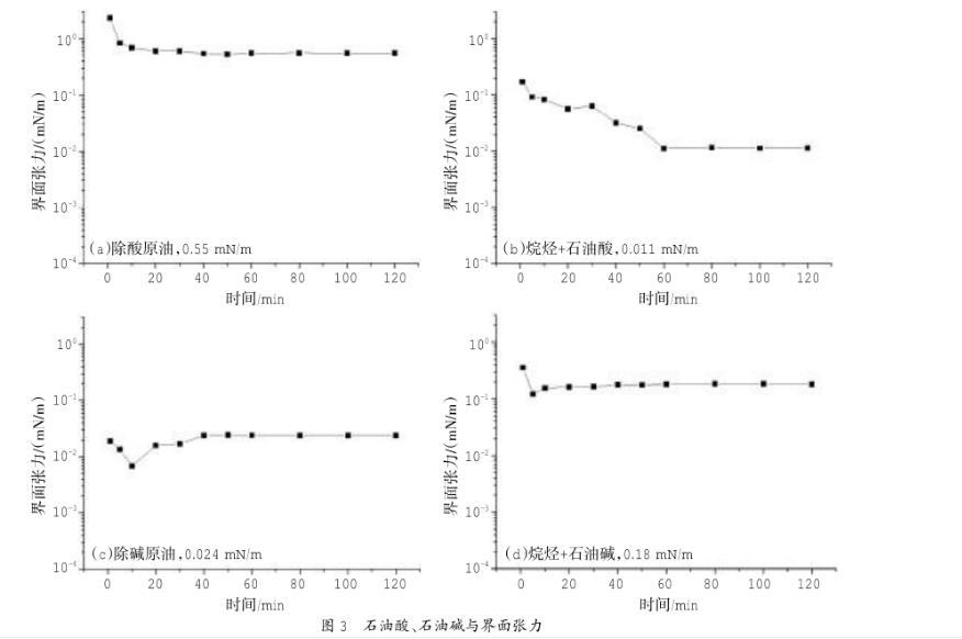 為研究遼河石油酸、石油堿與界面活性之間的關系,首先測量了遼河兩性表面活性劑與原油之間的界面張力,為0.005 2 mN/m,可以超低;也測量了表面活性劑與烷烴之間的界面張力,為1.38 mN/m,界面活性較差;在此基礎上考察石油酸、石油堿對降低界面張力的貢獻。由圖3可以看出,在原油剔除石油酸組分后,界面張力由超低陡然升高至0.55 mN/m,說明石油酸組分對超低界面張力的形成具有非常重要的作用,也說明在遼河油田的兩性表面活性劑二元復合驅中,石油酸組分依然發(fā)揮著原油活性物質的作用;在烷烴組分添加石油酸后,界面張力由1.38 mN/m降低至0.011 mN/m,兩個數量級的降低,進一步說明石油酸組分與遼河兩性表面活性劑之間具有明顯的相互作用,是有效降低界面張力的重要原油組分。