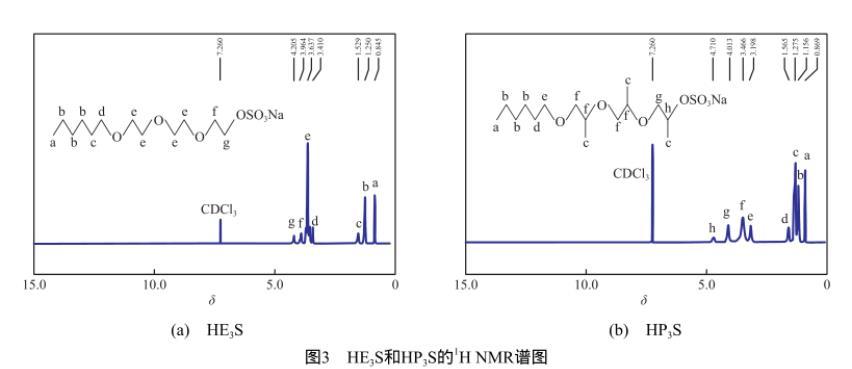 圖3為HE3S和HP3S的1H NMR譜圖。由于在合成過程中HE3和HP3為混合物,氫原子的化學位移(δ)會發生堆積,只能通過積分面積與δ確定特征基團的氫原子個數,而不能確定其裂峰[11]。由圖3(a)可知,δ=0.845(3H,—CH3),1.250(6H,—CH2—),1.529(2H,—CH2—),3.410(2H,—CH2O—),3.637(8H,—OCH2CH2O—),3.964(2H,—OCH2—),4.205(2H,—CH2OSO3Na),7.260(CDCl3)。由圖3(b)可知,δ=0.869(3H,—CH3),1.156(6H,—CH2—),1.275(9H,—CH3),1.565(2H,—CH2—),3.198(2H,—CH2O—),3.466(6H,—OCH2CH—O—),4.0 1 3(2 H,—O C H2—),4.7 1 0(1H,—CH—OSO3Na),7.260(CDCl3)。